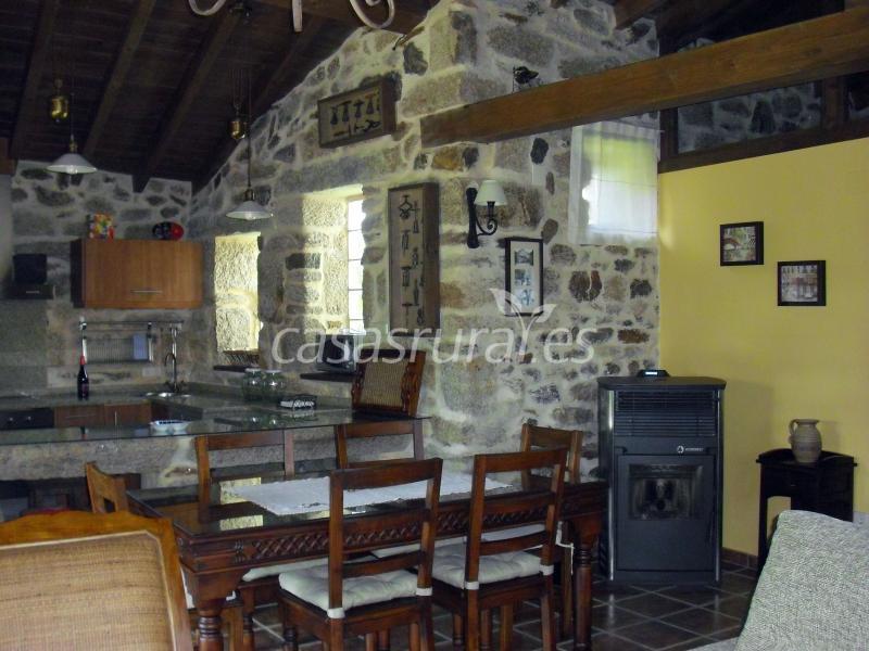 El interior de A Fornalleira se distribuye en un amplio espacio común en el que se encuentran una cocina americana, la zona de comedor y el salón, un baño con ducha y dos habitaciones.