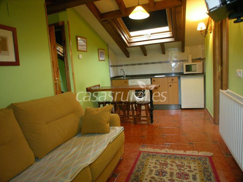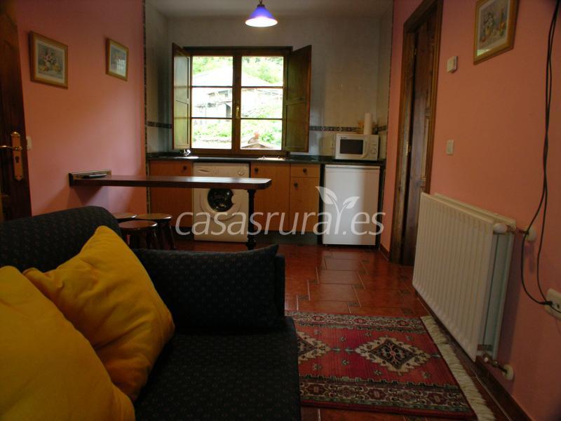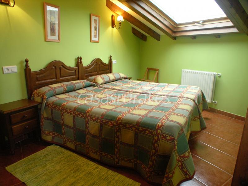 Los apartamentos uno por planta en la casa de arquitectura tradicional con un amplio patio de entrada , cada uno de ellos dispone de una habitacion con dos camas de noventa unidas , salon-cocina y baño con mampara de ducha. Equipamiento : vitrocera.