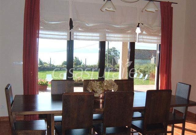La casa dispone de 4 hab. con baño (3 de matrimonio y 1 doble), 2 camas auxiliares, cuna, cocina completamente equipada (lavadora, lavavajillas, horno, microondas, cafetera, tostador, exprimidor, batidora, plancha..), amplio comedor con salida al porche, espacioso salón tv, dvd, música, lecturas, juegos de mesa, juegos de niños, gran porche con magníficas vistas a la ría, jardín de 2200 m2 con mobiliario de jardín, barbacoa y unas magníficas vistas sobre la ría. La casa se encuentra en una zona rural muy tranquila próxima al centro urbano de Rianxo (7 min. caminando), al paseo marítimo y a la playa anexa.