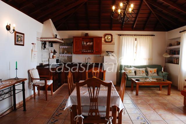Consta de tres espacios bien diferenciados: una amplia estancia que alberga la cocina, el salón y el comedor. Una habitación doble y baño. Además consta de terraza amueblada, habitación para lavadora y otros enseres, barbacoa y amplios jardines. Desde su terraza y jardines se puede contemplar la puesta de sol sobre el mar. La tranquilidad de la zona y la claridad del cielo hacen que el atardecer sea inolvidable.