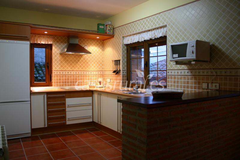 • Posee un amplio salón separado de la cocina por una barra de ladrillo rústico y madera. La cocina está amueblada con todo lo necesario, lavadora, frigorífico, microondas, vitrocerámica, campana extractora. El menaje es muy completo: sartenes, cazuelas, platos y vasos, cubiertos, paños de cocina...