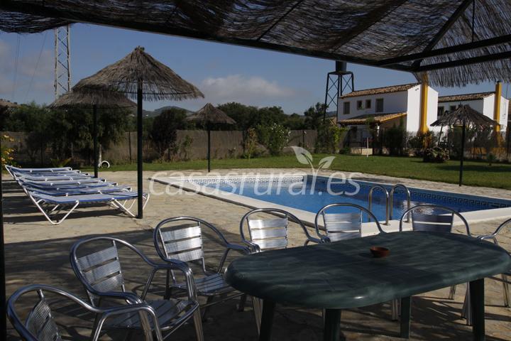 El cortijo dispone de una buena zona al aire libre toda cercada donde se puede disfrutar de futbolín, porterías de fútbol, columpios y barbacoas y una estupenda piscina de agua salada natural tambien cercada.