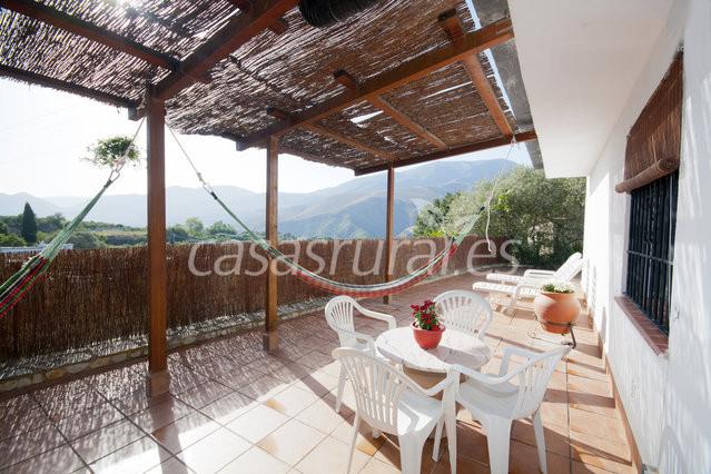 La terraza es de 120 m2 con maravillosas vistas sobre el valle del Guadalfeo, Sierra Nevada, Sierra Contraviesa, Sierra Lujar y el pueblo de Órgiva. Esta cubierta en parte por una pérgola de madera. Hay plantas de muchos tipos alrededor, con flores casi todo el año. También tiene una vid que trepa por la baranda con ricas uvas en Agosto y Septiembre.