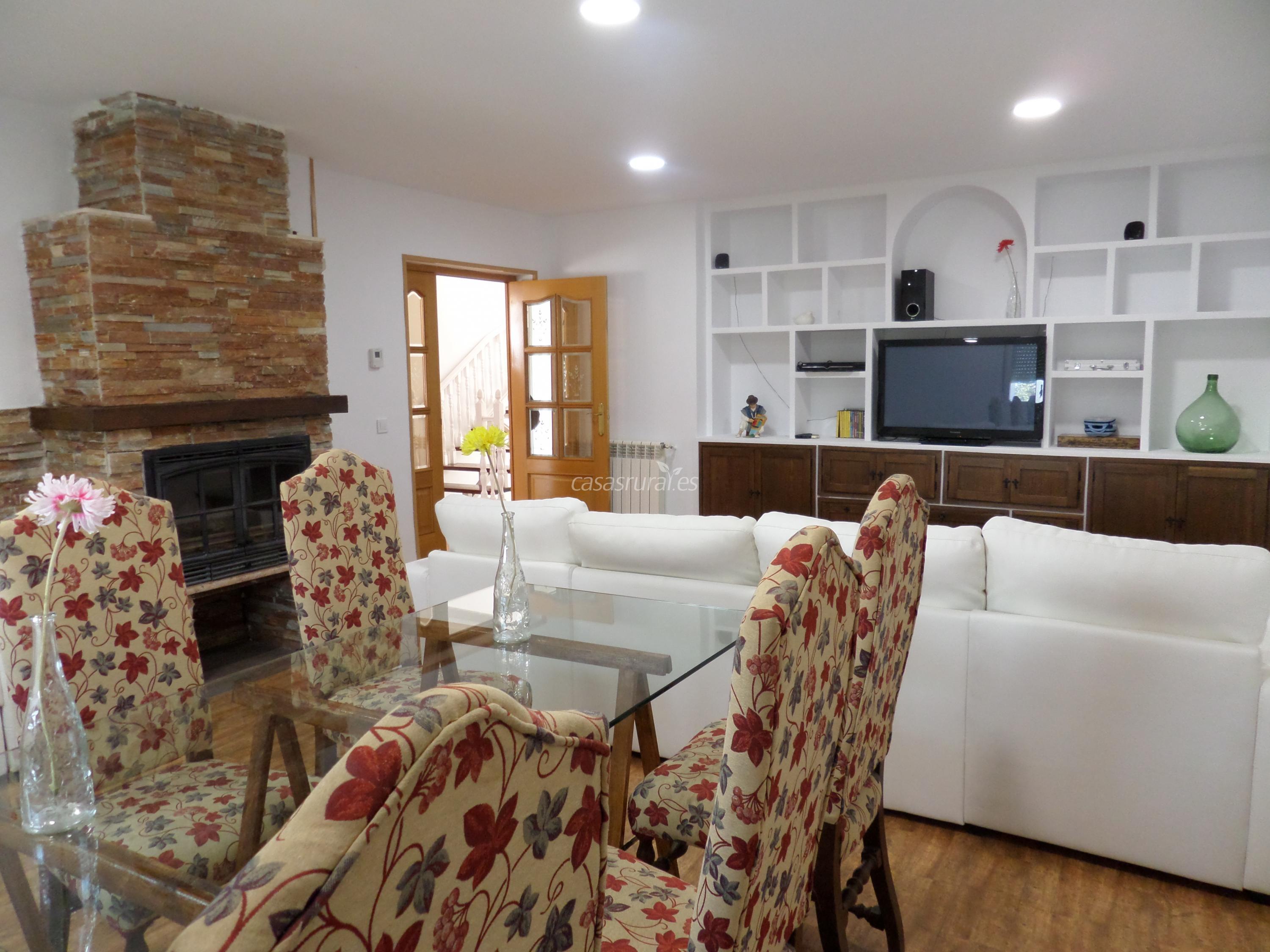 Salón comedor con chimenea, 2 sofás camas doble y triple, televisor de 42" equipo de música y DVD.