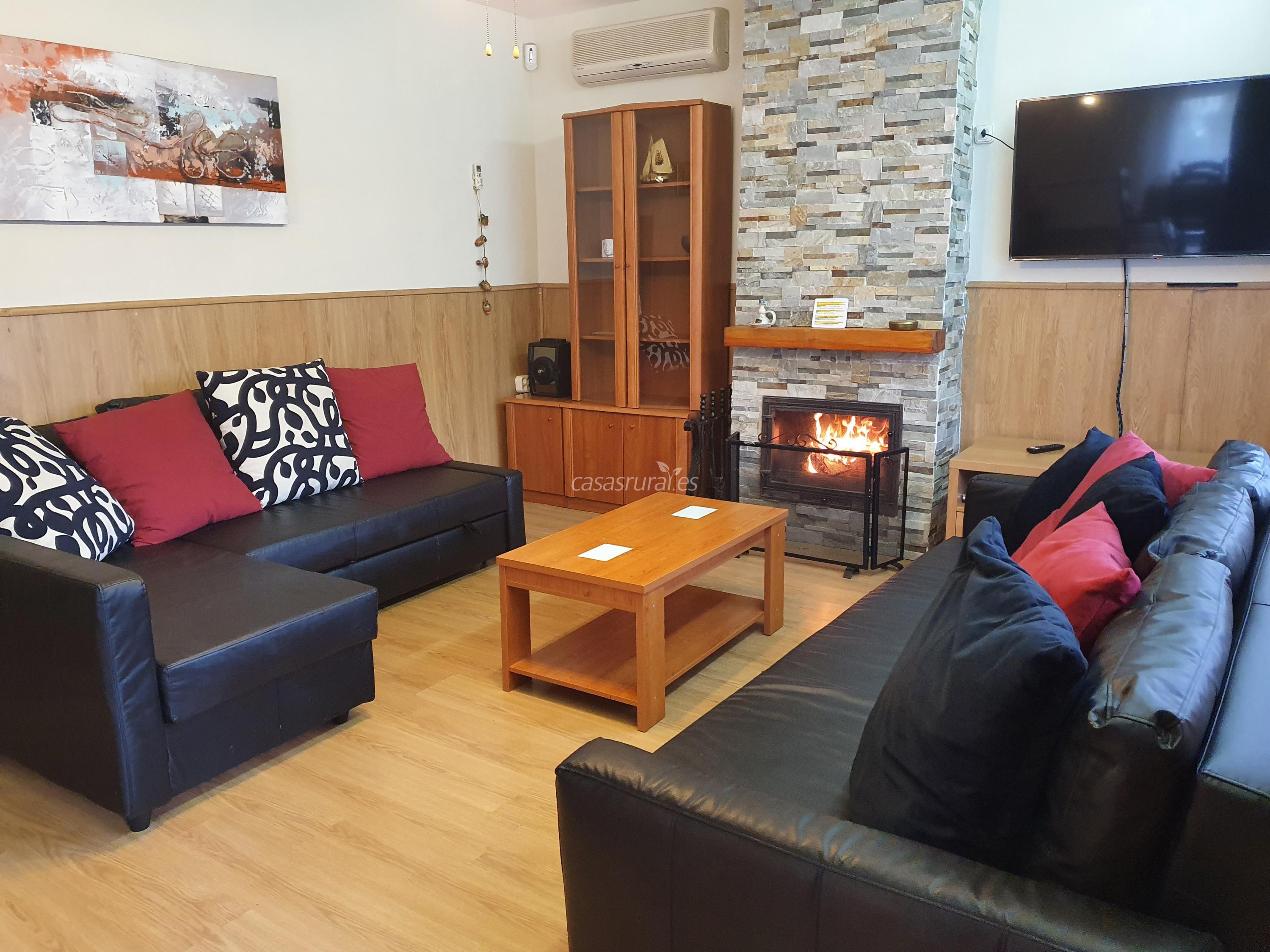 Amplio Salón con Chimenea y Comedor Independiente, 2 Sofás Cama, uno con 2 camas individuales de 90 cm. y 1 sofá cama de 1,40 cm. Televisor LCD de 50" y DVD con películas Dvd de diferentes géneros.