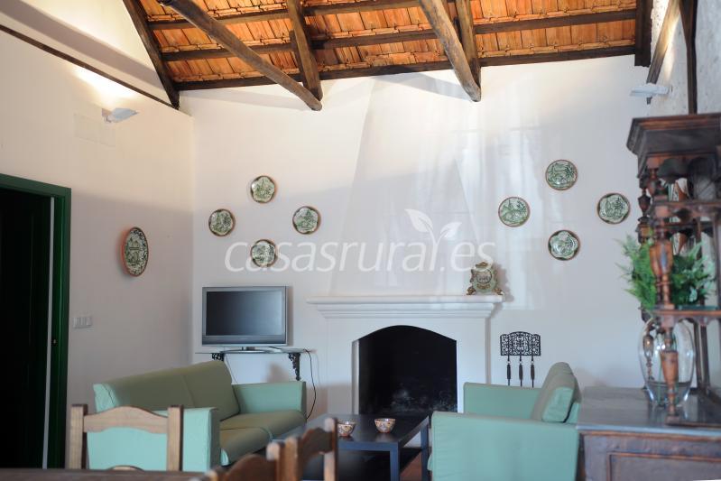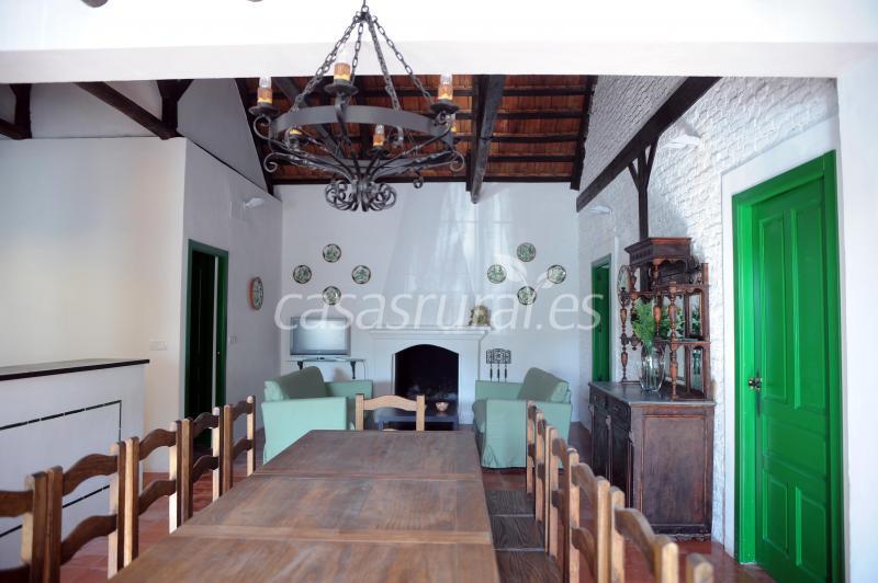 El salón está equipado con televisión pantalla plana, chimenea y aire acondicionado. Mesa para 14 comensales y dos sofás.