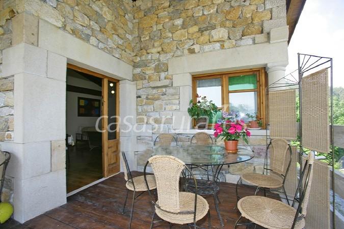 El salón y comedor es amplio: 35 metros cuadrados, con chimenea rustica, y tiene un porche cubierto exterior con mesas y sillas para disfrutar del paisaje a la luz del dia o por la noche.