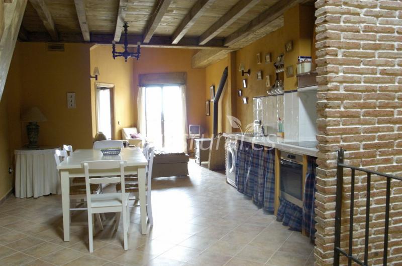 Dispone de un amplio salón con chimenea, y cocina totalmente equipada (vajilla, cubertería, menaje, nevera, microondas, horno, etc. )