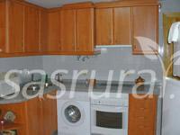 Cocina con microondas, nevera, horno, lavadora y office.